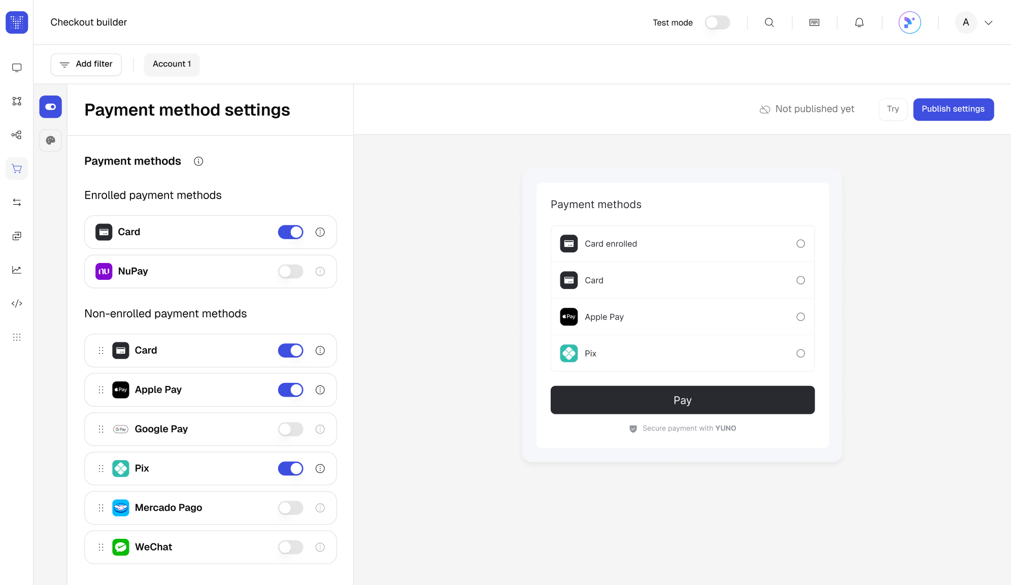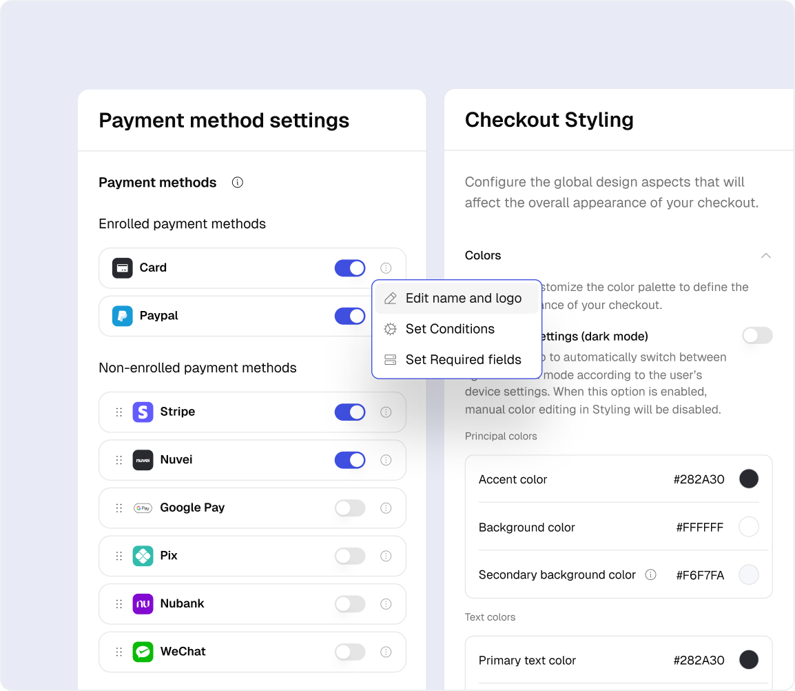 Enjoy granular control over visual components across any device, set conditions to display local payment methods based on markets, and easily toggle payment methods on or off.