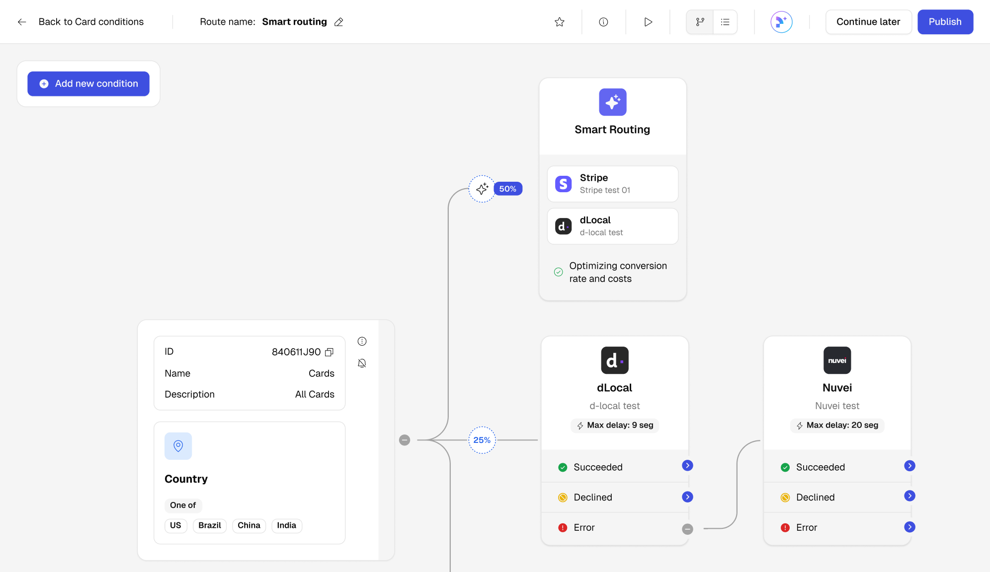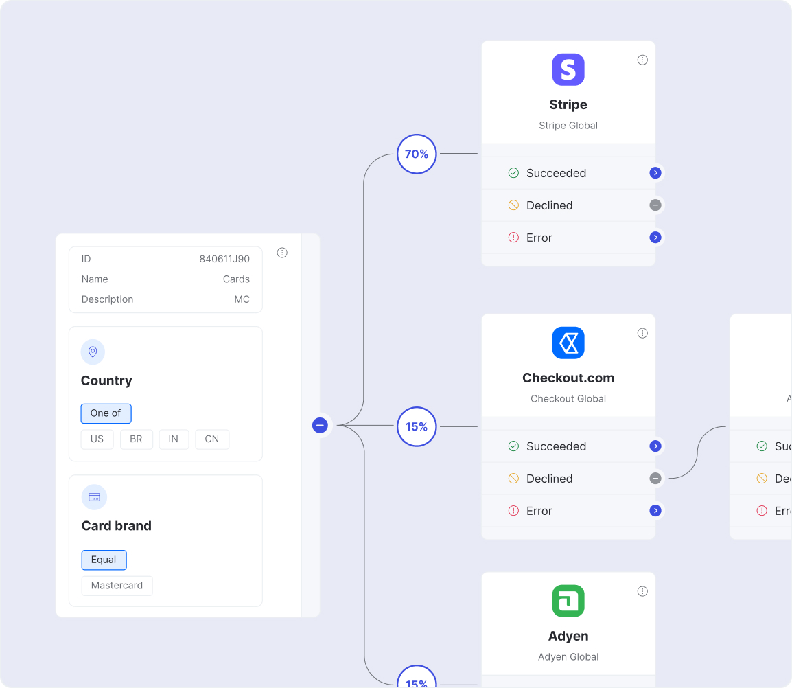 Split payments across different providers for A/B testing and set custom conditions, like card type, issuer country, and more to route each transaction optimally.