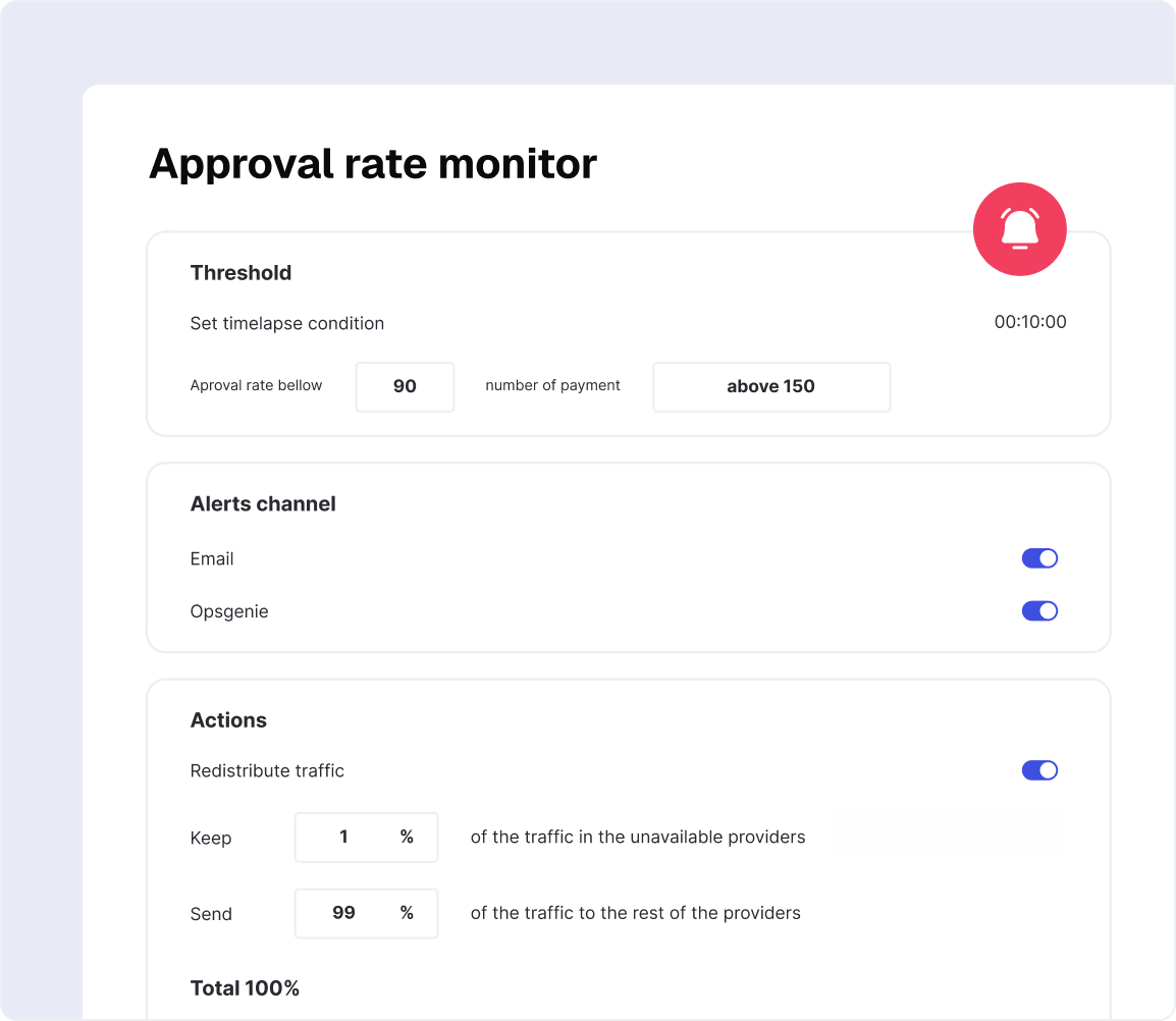 Monitors reroutes payments to a backup provider and instantly alerts your team, ensuring operational efficiency across all payment flows.